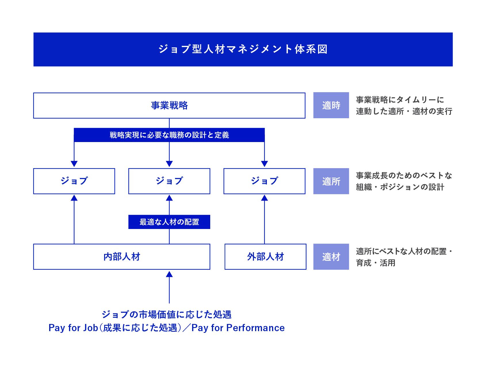 「ジョブ型人材マネジメント」とは、「適時適所適材」と「キャリア自律」を実現し、「選び・選ばれる」関係を構築するための仕組みやマネジメントです。